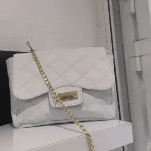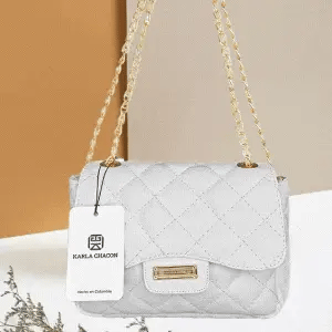Incluye el bolso Karla Chacón Roma en color blanco, con cadena dorada y bolsillo interno con cierre.