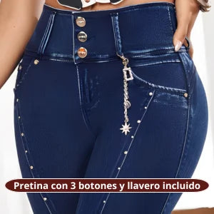 La pretina alta con 3 botones recoge y centra la zona media.