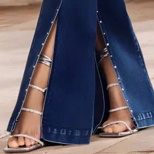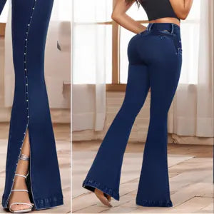 Tiro alto con bota campana y aberturas frontales; fit limpio sin bolsillos.