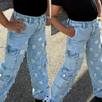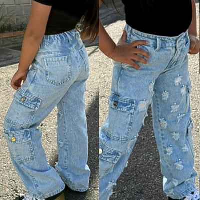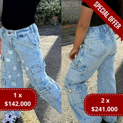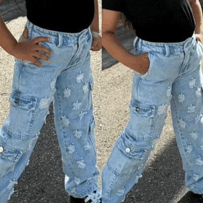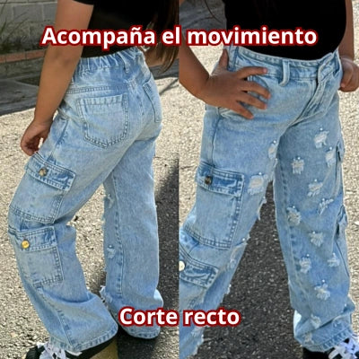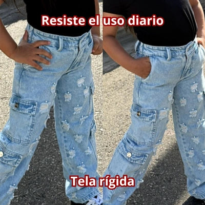 Denim rígido y costuras firmes aguantan parque y recreo.
