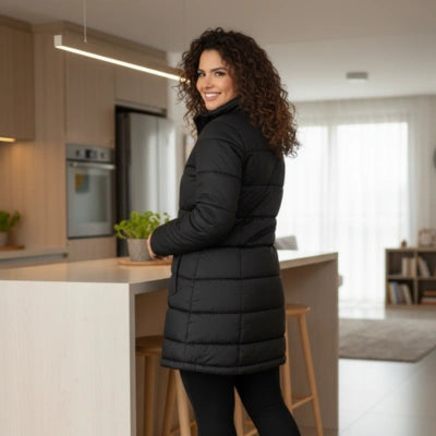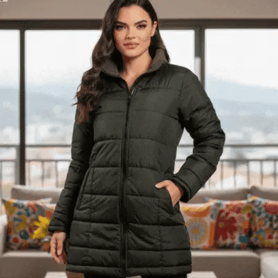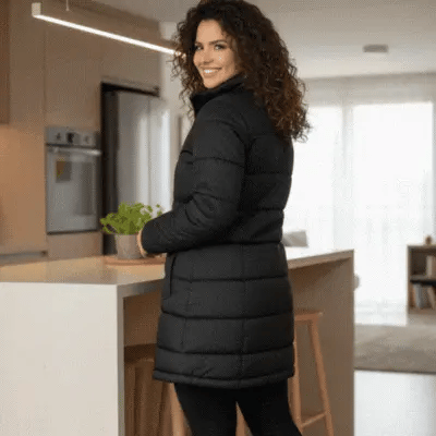 Es larga de largo medio, cubre cadera y parte superior del muslo, ideal si te gusta sentir abrigo real.