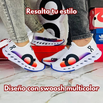 El diseño blanco limpio con swoosh multicolor resalta en cualquier outfit, logrando que cada paso se convierta en un detalle de moda.