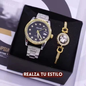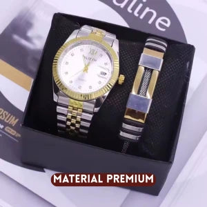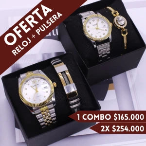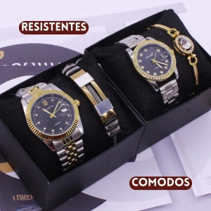 Hombre: Pulsera de cuero con acero y reloj en plateado/dorado y Mujer: Pulsera de acero con imitación de diamante y reloj en plateado/dorado.