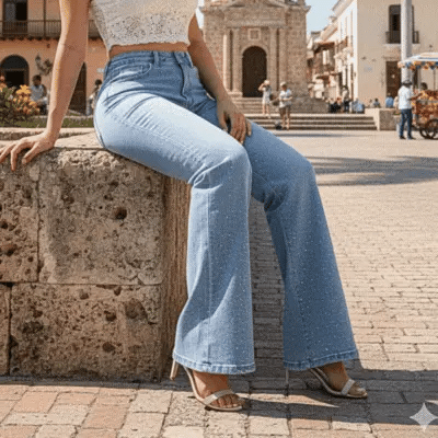 El tiro alto del jean recoge la zona del abdomen y marca la cintura, mientras la bota amplia equilibra la silueta y genera un efecto estilizado.