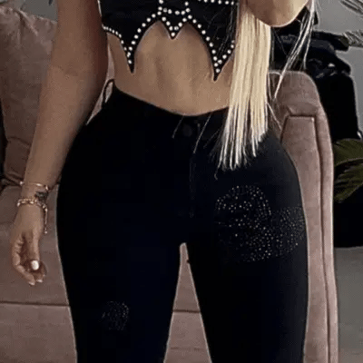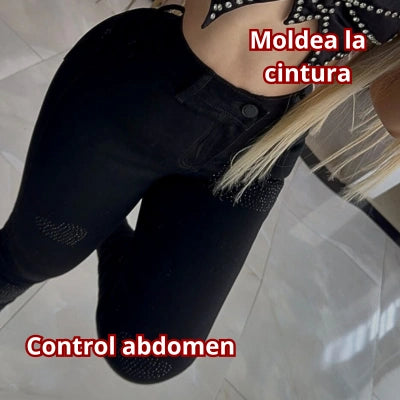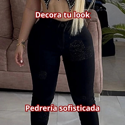 Detalles: Pedrería en cintura y rodillas, bolsillos posteriores funcionales.