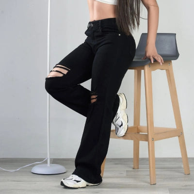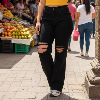 Diseño de rotos: Rotos tipo destroyer ubicados a la altura de la rodilla, con acabado deshilachado controlado.