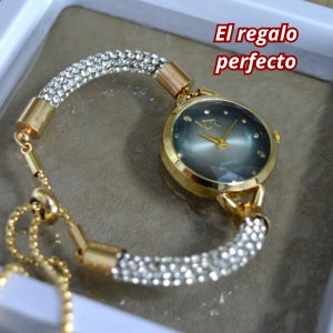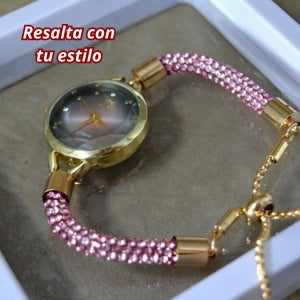 GlamTime es un reloj tipo joya con pulso metálico y colores vibrantes, perfecto para complementar cualquier atuendo.