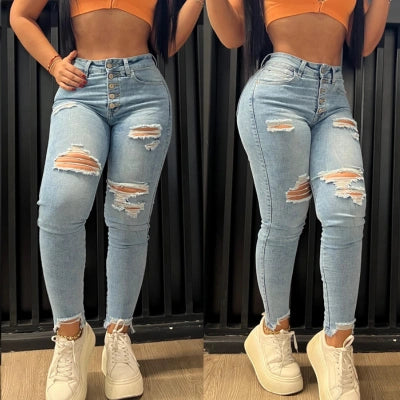 Son rotos tipo destroyer pensados para verse modernos sin dejar el jean completamente descubierto. Son visibles, pero no extremos.