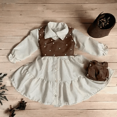 Unidad: vestido camiserón + chaleco en cuerina o denim con perlas + bolsito a juego.
